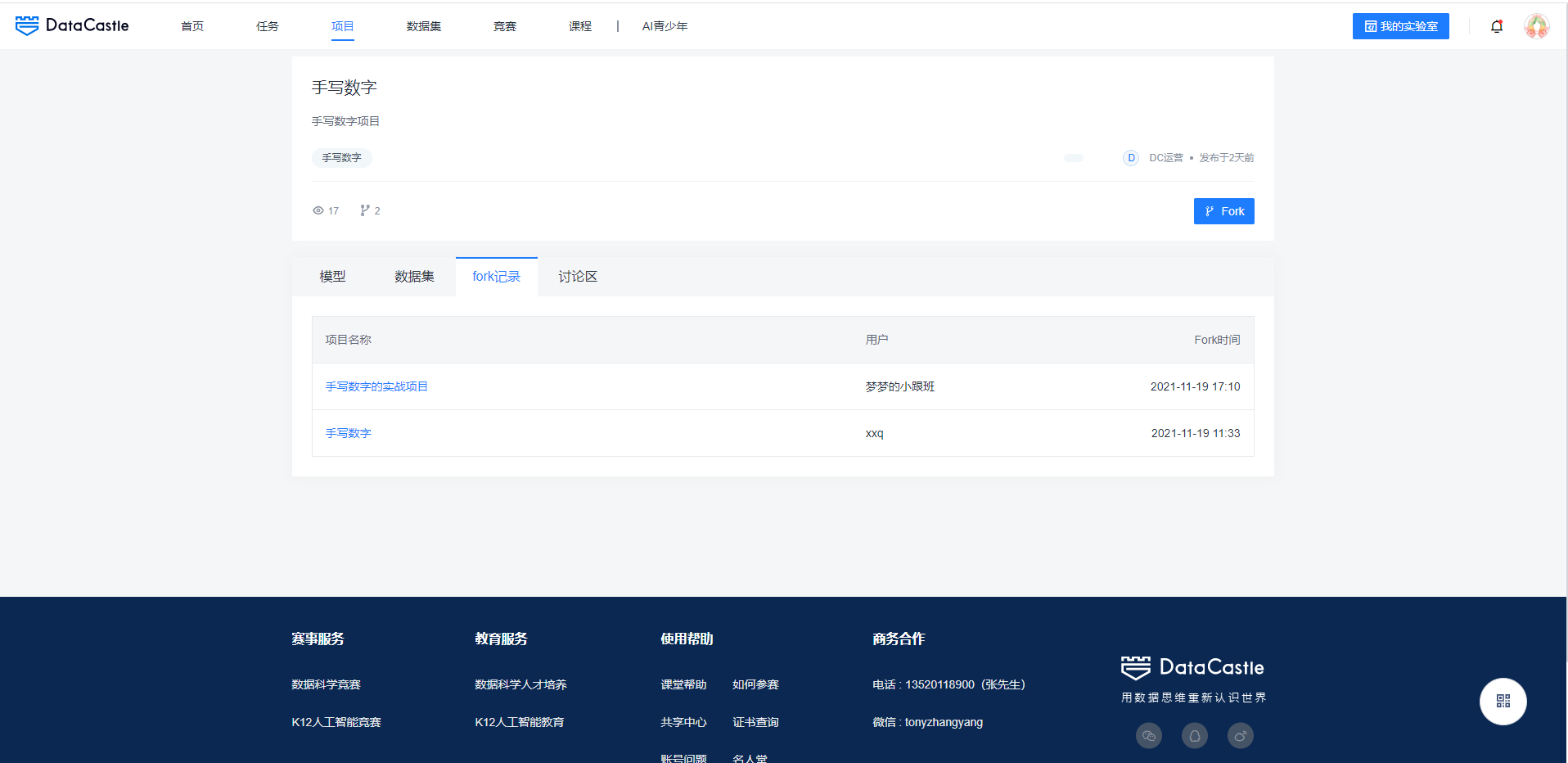 展示当前项目被Fork的历史记录信息,点击项目名称可以跳转对应的项目详情,支持翻页查看。
