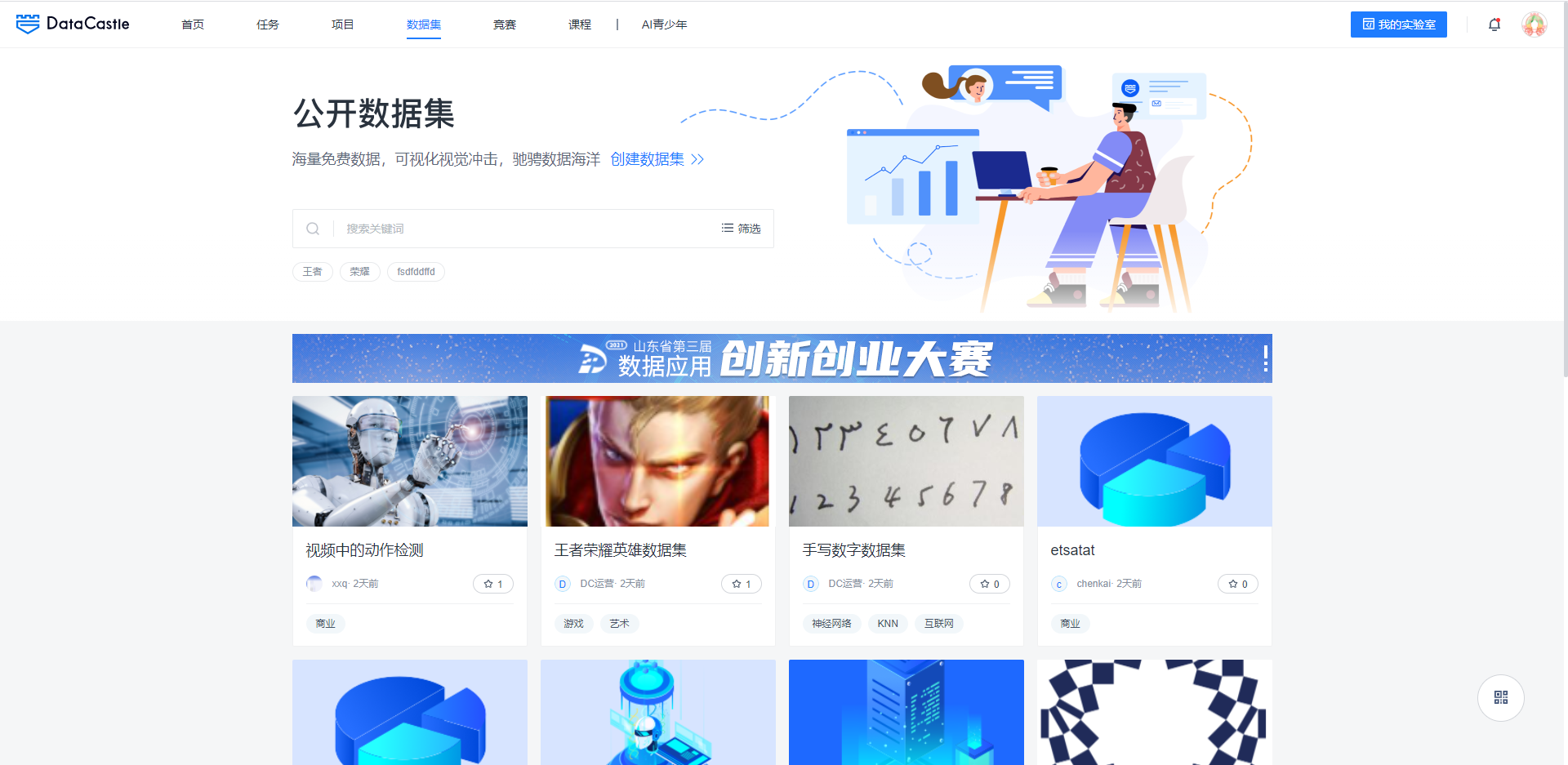 数据集展示按照卡片的方式进行呈现,卡片上主要展示的信息有:数据集名称、数据集标签、发布人、发布时间、收藏数量。